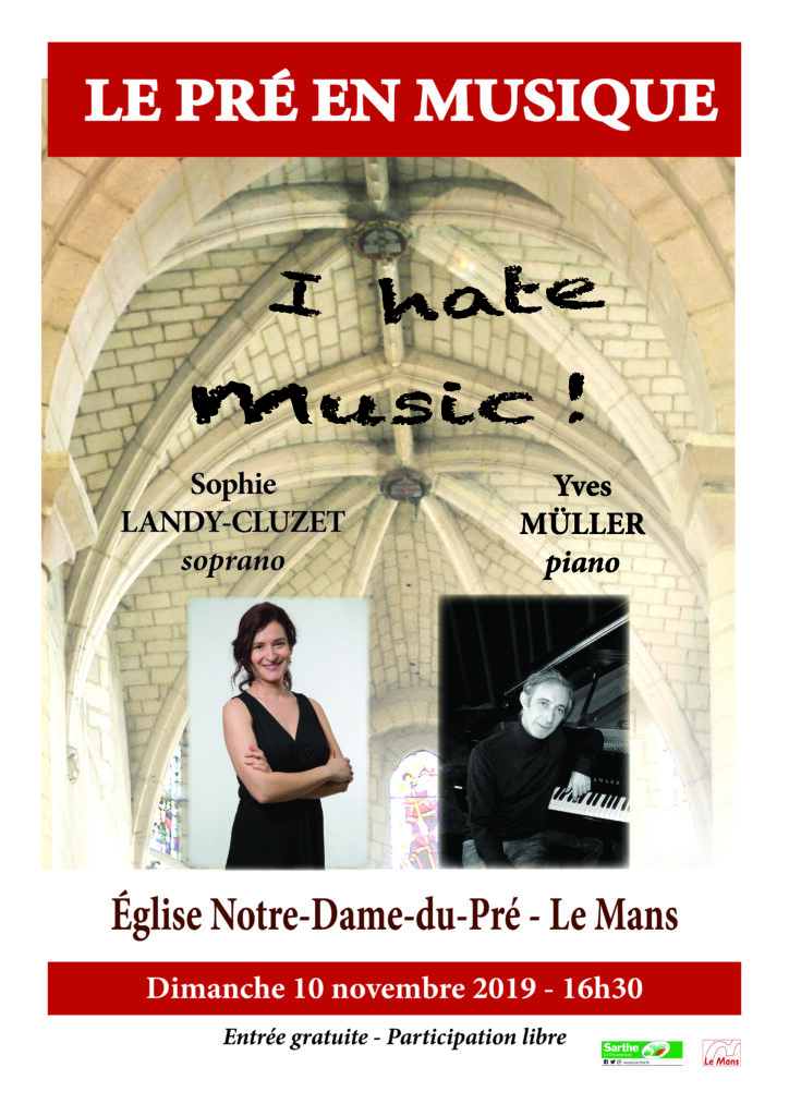 I hate music !Sophie LANDY-CLUZET, sopranoYves MÜLLER, piano 1ère Partie An die Musik (À la musique) Franz SCHUBERT (1797-1828) Mazurka Op. 17 n° 4 (piano seul) Melodia Moja pieszczotk (Ma mignonne) (Adam Mickiewicz) Fryderyk CHOPIN (1810-1849) Poźegnanie (L’adieu) Polska młodzieź (Les gars polonais) XIIIe improvisation en La mineur (piano seul) C (Louis Aragon) Francis POULENC…