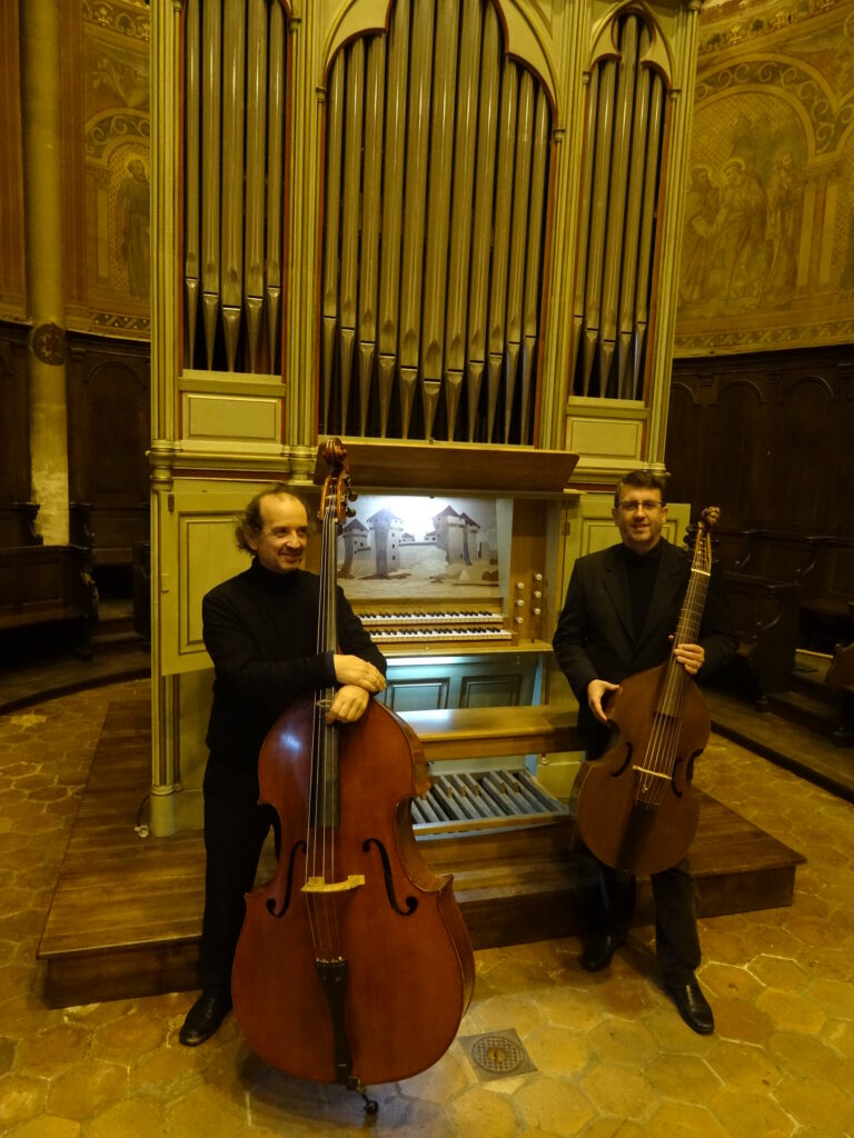 gambe voyagent à travers le temps comme si ces deux cousines trouvaient enfin l’occasion de converser après si longtemps. En effet au XVIe siècle, l’ancêtre de la contrebasse et la viole de gambe faisaient partie de formations instrumentales communes. Du reste, de nombreuses caractéristiques leurs sont communes comme au niveau de leur formes, notamment ces épaules tombantes, au niveau de la douceur du son, de leur ressemblance avec la voix humaine. Pourtant, leur utilisation commune a disparu au profit, par exemple pour la contrebasse, d’une utilisation dans l’orchestre ou dans le jazz. L’éviction des violes dans les formations orchestrales faillit même les faire tomber dans l’oubli au profit des violoncelles. C’est donc aujourd’hui une nouvelle alliance à laquelle nous assistons, une alliance humaine et instrumentale. Se confronter à un répertoire nouveau conçu de façon spécifique permet d’allier la richesse des timbres à l’expressivité naturelle de chacun de ces deux instruments. Les souffles des archets s’emmêlent et procurent à l’auditeur une sensation inédite. Mais, alors que la contrebasse résonne dans la viole de gambe et inversement, Michaël Durand rejoint son orgue où les tuyaux se remplissent d’air et résonnent de concert avec le son de la contrebasse. Le choix judicieux des « jeux » de l’orgue qu’il réalise lui permet de nous faire partager la beauté des œuvres de l’époque baroque, notamment celles de Bach ou de Clérambault. Des compositions originales réalisées pour orgue et contrebasse par Christophe Picot permettent de découvrir des facettes insoupçonnées de ces deux instruments qu’il n’était pourtant pas rare de rencontrer dans les églises pour l’accompagnement des chœurs lors des cérémonies religieuses. En effet du XVIIIe siècle jusqu’à la fin du XIXe siècle, l’utilisation de la contrebasse était répandue dans les églises où elle soutenait les chants et renforçait les fondements sonores de l’orgue.