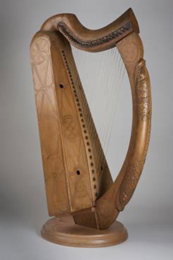 Apparue en Europe occidentale vers les années 1100, mais d’un usage courant à partir des VIIIe-IXe siècles, la harpe fut un instrument très en vogue au Moyen-Âge, pour être supplantée par le luth au XVe siècle. Elle est aussi symboliquement l’instrument du roi biblique David. Elle était en usage en répandu en Irlande Écosse, Pays de Galles, Bretagne et Galice (cláirseach en irlandais, clàrsach en gaélique écossais). Elle a été l’instrument par excellence de l’Irlande qui l’incorpora à son blason au XIIIe siècle. Elle accompagne les poèmes épiques et devient un instrument soliste de cour, puis à partir du XVIe siècle son usage décline sous la domination anglaise qui en bannit l’usage en Irlande et en Écosse. L’intérêt pour les cultures et traditions populaires, les collectes effectuées dans les milieux ruraux, la remet à l’honneur au XIXe siècle. La caisse de résonance était taillée dans un bloc de chêne ou de saule, la colonne très courbée, avec des cordes métalliques (en cuivre en Irlande ancienne), ou en boyau. Le harpiste faisait reposer son instrument sur la hanche et contre l’épaule. Les cordes étaient jouées avec les ongles, les aigus pour la main gauche, les graves pour la main droite. L’instrument, diatonique, comporte 12 à 30, voire 50 cordes, dans un ambitus allant jusqu’à quatre octaves, un système de palettes associées au chevillage peut hausser l’intonation d’un demi-ton. Elle a été exportée par les Espagnols en Amérique latine où elle est particulièrement prisée au Paraguay.