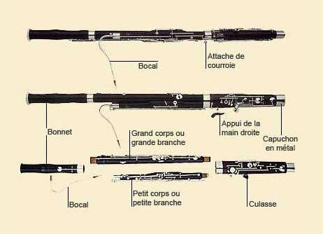 - le bois utilisé : le basson français est en palissandre de Rio, le basson allemand (système Heckel) en érable verni.