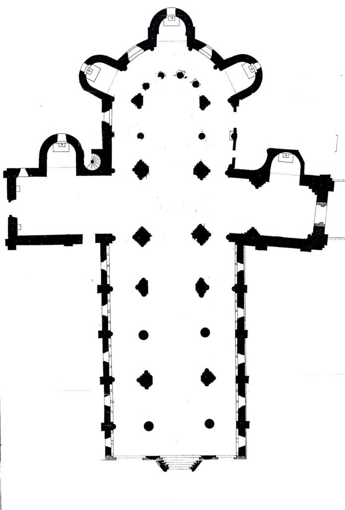 Le plan ci-dessus représente ce qu’était alors cet édifice dans son intégralité. Il permet  de voir que le chœur, ainsi que le transept sud, se trouvent légèrement inclinés vers la droite, rappel de la position de la tête du Christ en Croix.
