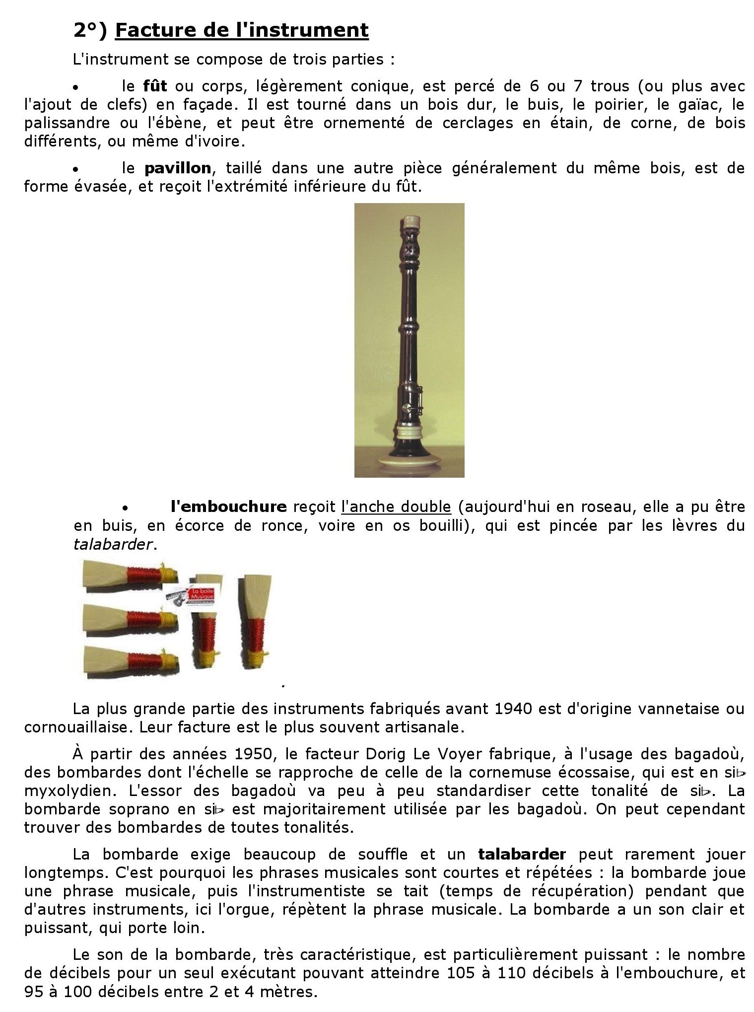 La plus grande partie des instruments fabriqués avant 1940 est d’origine vannetaise ou cornouaillaise. Leur facture est le plus souvent artisanale. À partir des années 1950, le facteur Dorig Le Voyer fabrique, à l’usage des bagadou, des bombardes dont l’échelle se rapproche de celle de la cornemuse écossaise, qui est en sib myxolydien. L’essor des bagadou va peu a peu standardiser cette tonalité de sib. La bombarde soprano en sib est majoritairement utilisée par les bagadou. On peut cependant trouver des bombardes de toutes tonalites. La bombarde exige beaucoup de souffle et un talabarder peut rarement jouer longtemps. C’est pourquoi les phrases musicales sont courtes et répétées : la bombarde joue une phrase musicale, puis l’instrumentiste se tait (temps de récupération) pendant que d’autres instruments, ici l’orgue, répètent la phrase musicale. La bombarde a un son clair et puissant, qui porte loin. Le son de la bombarde, très caractéristique, est particulièrement puissant : le nombre de decibels pour un seul exécutant pouvant atteindre 105 a 110  décibels a !’embouchure, et 95 a 100  decibels entre 2 et 4 mètres.