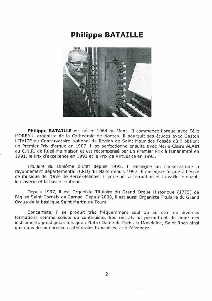Philippe BATAILLE est né en 1964 au Mans. II commence l’orgue avec Félix MOREAU, organiste de Ia Cathédrale de Nantes. II poursuit ses études avec Gaston LITAIZE au Conservatoire National de Region de Saint-Maur-des-Fossés ou il obtient un Premier Prix d’orgue en 1987. II se perfectionne ensuite avec Marie-Claire ALAIN au C.N.R. de Rueil-Malmaison et est récompensé par un Premier Prix a l’unanimité en 1991, le· Prix d’excellence en 1992 et le Prix de Virtuosite en 1993. Titulaire du Diplôme d’État depuis    1995, iI enseigne au  Conservatoire    à rayonnement départemental (CRD) du Mans depuis 1997. II enseigne l’orgue a l’école de musique de l’Oreée de Bercé-Belinois. II poursuit sa formation et travaille le chant, le clavecin et la basse continue. Depuis 1997, il est Organiste Titulaire du Grand Orgue Historique (1775) de l’église Saint-Cornely de Carnac. Depuis 2008, il est aussi Organiste Titulaire du Grand Orgue de la basilique Saint Martin de Tours. Concertiste,  il  se  produit  très  fréquemment  seul  ou  au  sein  de  diverses