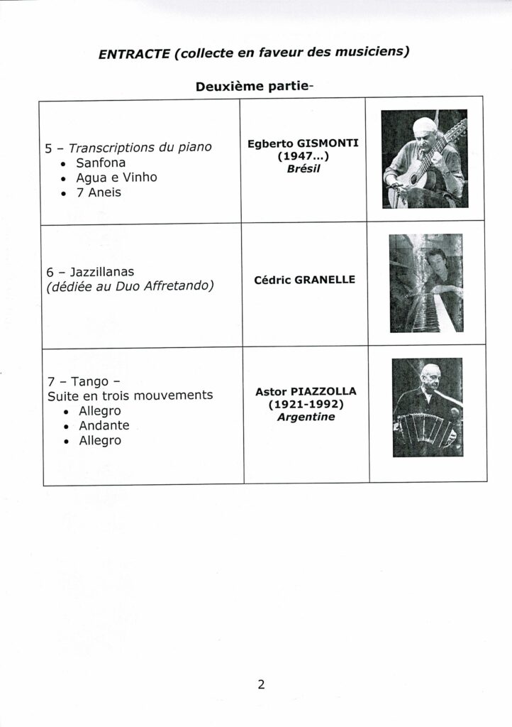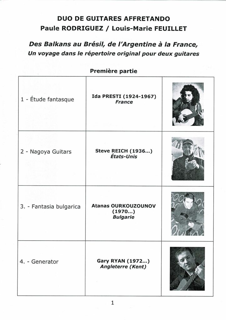 Le programme que nous proposons ici trace un panorama des tendances actuelles de l’écriture originale pour duo de guitare (à l’exception des pièces d’Egberto Gismonti, lui-même guitariste), nous faisant voyager de l’Amérique du Sud à l’Europe Centrale, explorant des langages musicaux aussi riches que variés, exploitant toutes les possibilités de cette combinaison instrumentale. Et si la route de l’argentin Piazzolla n’est pas précisément proche de celle de l’anglais Gary Ryan, si la voie du brésilien Gismonti n’est pas celle du bulgare Ourkouzounov, les uns et les autres ont pourtant la même conscience aigüe des possibilités du duo de guitares et savent à merveille utiliser cette « guitare à douze cordes” et lui confier Ieur univers musical.