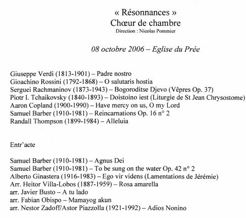Créé au Mans au sein du collège Saint Louis, sous I’égide de Claude Chotard, « Résonnances » s’est constitué en association loi 1901 en automne 1969. De 1971 à 1989, ce groupe prend son essor sous la direction d’Yves Parmentier. Au cours de cette période se constituent les deux formations. Cet ensemble acquiert une renommée internationale en participant au concours d’Arezzo (Italie, 3ème prix), de Gorizzia (Italie, 1er prix), et au Florilège de Tours (1er prix, Grand prix). L’ensemble a également effectué des tournées en Autriche, Allemagne, Angleterre, Belgique, Espagne, Hongrie et Tchéquie. En 1989, Yves Parmentier quitte Le Mans. Valérie Fayet prend la direction du chœur jusqu’en juin 1999, date à laquelle elle confie sa baguette à Jean-Dominique Abrell, remplacé par Nicolas Pommier. Le chœur RÉSONNANCES est constitué d’une cinquantaine de choristes. Son travail a été essentiellement orienté vers la mise en place d’œuvres importantes données avec orchestres (messes, oratorios, passions, etc.). Cela n’exclut pas pour autant des programmes à thèmes (musique française, musique romantique allemande, …) le plus souvent réalisés avec piano ou continuo. Actuellement, il s’attache notamment à faire découvrir un programme de musique contemporaine de tous les pays (Angleterre, États-Unis, Finlande, Estonie, Espagne, etc.). En 2005, le chœur a participé à cinq concerts accompagnés par l’Orchestre National des Pays de la Loire pour la représentation de la symphonie « Résurrection » de Gustav Mahler. L’Ensemble Vocal est une formation restreinte de seize choristes. Son répertoire est constitué essentiellement d’œuvres a cappella de caractère plus intimiste que les œuvres travaillées par le chœur. Ses membres sont issus de la grande formation. Son programme actuel est consacré aux musiques de la Renaissance. Les projets du chœur sont nombreux pour la saison à venir. « Résonnances » participera notamment au festival de l’abbaye de l’Épau en donnant la « Pauken-Messe » de Joseph Haydn. En juillet 2007, le chœur se présentera également au concours international de Torrevieja en Espagne.