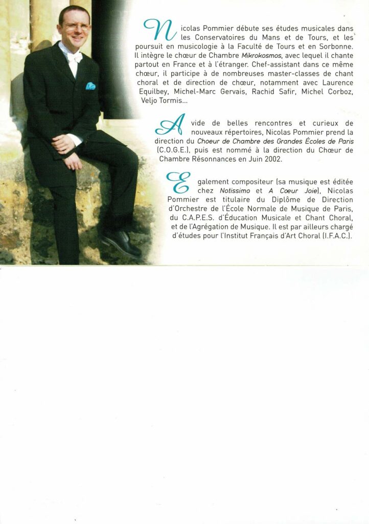 C’est ce que le Chœur de Chambre Résonnances et moi-même nous vous proposons ce soir, avec un voyage à travers le monde. Nous garderons toujours un pied en France, mais nous irons visiter aussi l’Angleterre, I’Espagne, l’ltalie, I’Allemagne, la Hongrie, I’Estonie, la Finlande, les États-Unis … Un tour du monde musical pour lequel nous vous invitons à nous accompagner, afin de célébrer ensemble l’universalité du chant choral, à travers le temps et l’espace…