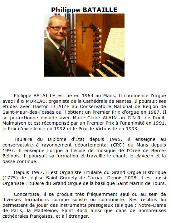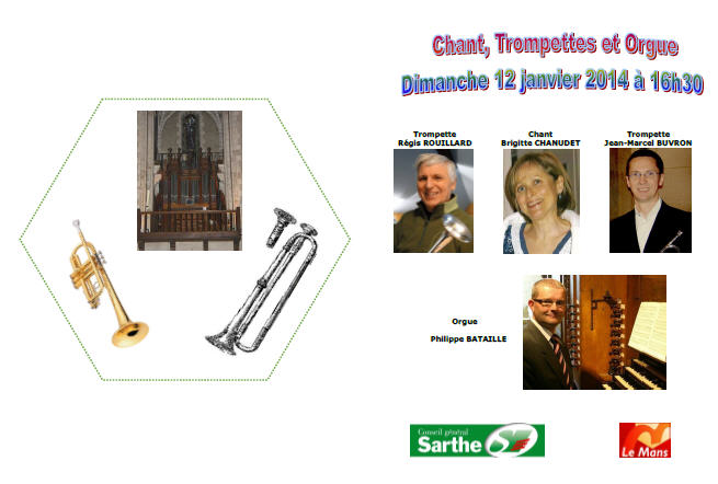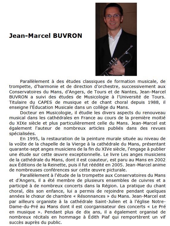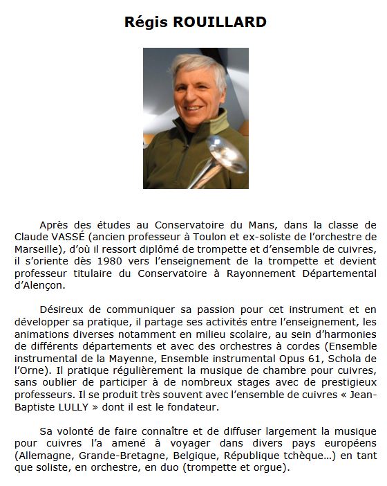 Ensemble de Trompettes MOSAÏQUE Dominique CORMIER – Titulaire de la médaille d’or de l’E.N.M. du Mans – Responsable et professeur à l’E.M.M. d’Allonnes. Sophie GRIMAULT – D.E. de trompette – Professeur à l’E.N.M.D.CD. de Cholet – Trompette solo à la Philar de Nantes. Anthony LANGEREAU – Professeur de trompette et chargé des études à l’école…