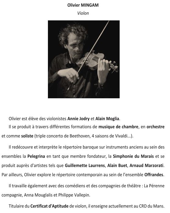 Marin TROUVÉ (alto) a participé au concert du 1er juin 2014 (6e saison) – Quatuor Violon, Alto, Hautbois et Violoncelle Marin TROUVÉ est né le 16 décembre 1981. Il commence l’alto à 8 ans au C.N.R. de Rennes où il travaille avec Madame Jacqueline Boyer et Monsieur Emmanuel Foucher. A 14 ans, il est admis…